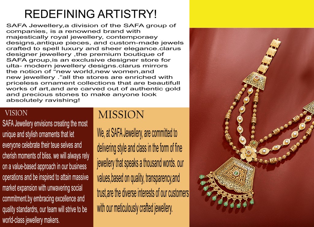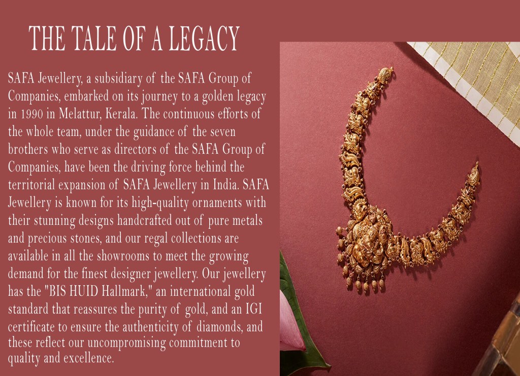 SAFA Jewellery launched its flagship store in 1990 in Melattur, Kerala, showcasing the magnificence of pure ornaments. Over the course of three decades, SAFA has garnered a reputation as a well-respected and widely recognized brand within the state of Kerala. We guarantee the delivery of fine-cut quality products while adhering to the customer-friendly approach that has made us Kerala’s most popular brand. The traditional handcrafted designs and detailing, combined with fine-cut machinery support, enable us to produce unique jewellery.